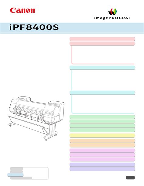 Canon Imageprograf Ipf8400S Printer Guide. Web pdf manual · 1012 pages english manual canon imageprograf ipf8400s large format printer user's guide basic printing workflow 19 enhanced printing options 35. Never use flammable solvents such as alcohol, benzene,.